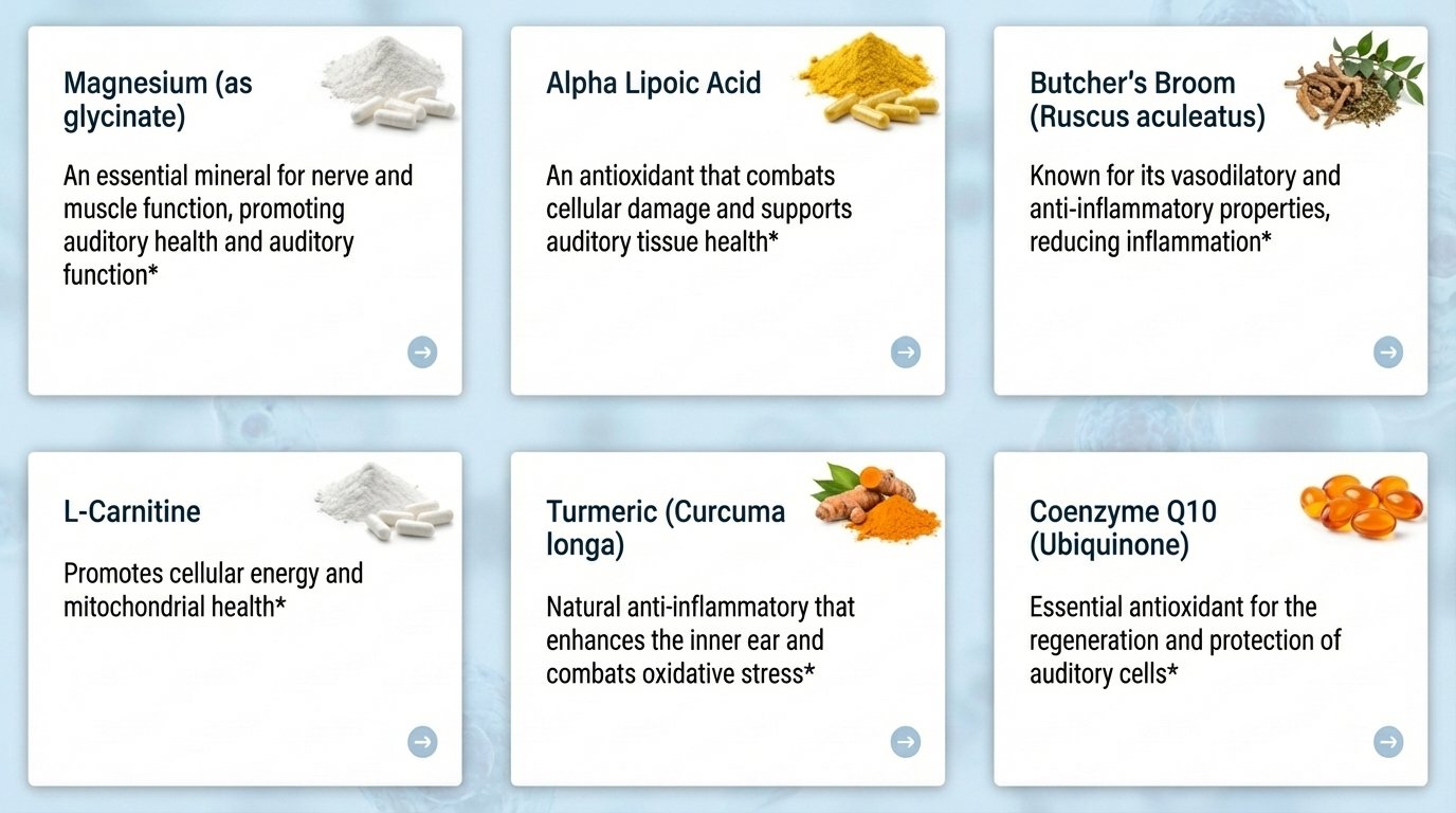 The formula interacts with the body’s natural anti inflammatory and regenerative pathways to calm irritation in ear tissues, reduce oxidative stress that accelerates auditory nerve damage, and promote healthy cellular energy production in the cochlea. Key compounds like Butcher’s Broom and L Carnitine enhance blood flow to the inner ear, while Magnesium Glycinate calms nerve hyperactivity, a key driver of that persistent ringing sensation.